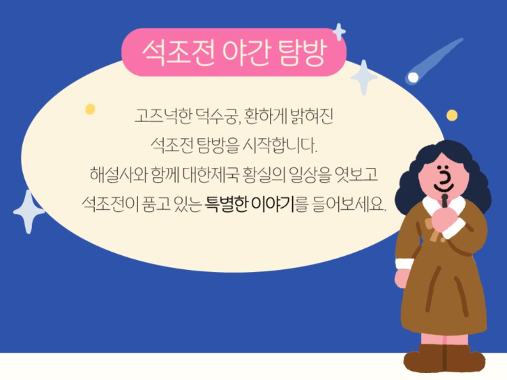 2021년부터 시작된 밤의 석조전 행사는 덕수궁 석조전 내부를 관람 후 테라스 카페에서 커피와 디저트를 즐기며 접견실에서 뮤지컬을 관람하는 체험 프로그램입니다.