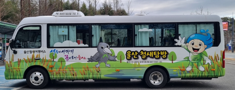 울산시는 태화강, 동천, 회야강, 울산만을 철새들이 안전하게 이동할 수 있는 길로 만들었습니다. 고려아연(주)에서 철새 탐조 전용 전기버스를 기증해 줬는데요. 이 버스는 전국 최초 철새 탐조버스이며 무료로 운영되고 있습니다.